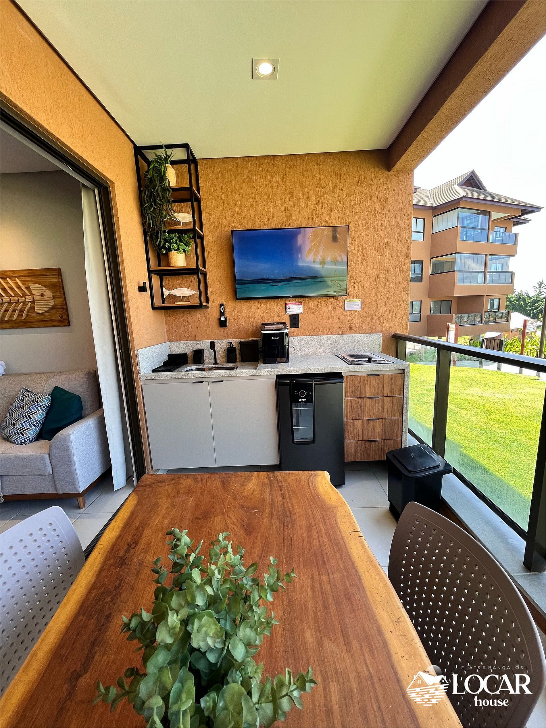 The gourmet balcony features a rustic table, ice machine, electric grill, cooler, and beer fridge – perfect for leisure moments.