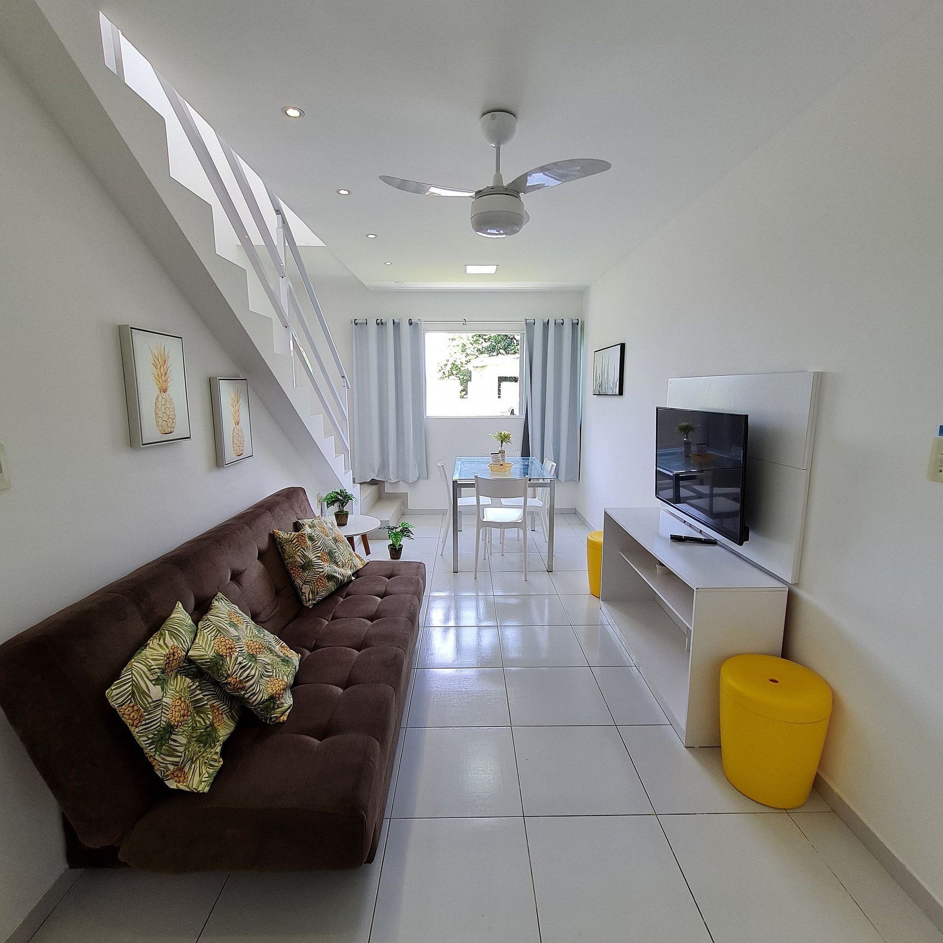 The living room, designed for two environments, is cozy and airy, featuring a sofa bed and ceiling fan. It integrates perfectly with the fully equipped kitchen, which includes a stove, refrigerator, microwave, blender, sandwich maker, and all necessary utensils to prepare your meals with practicality and style.