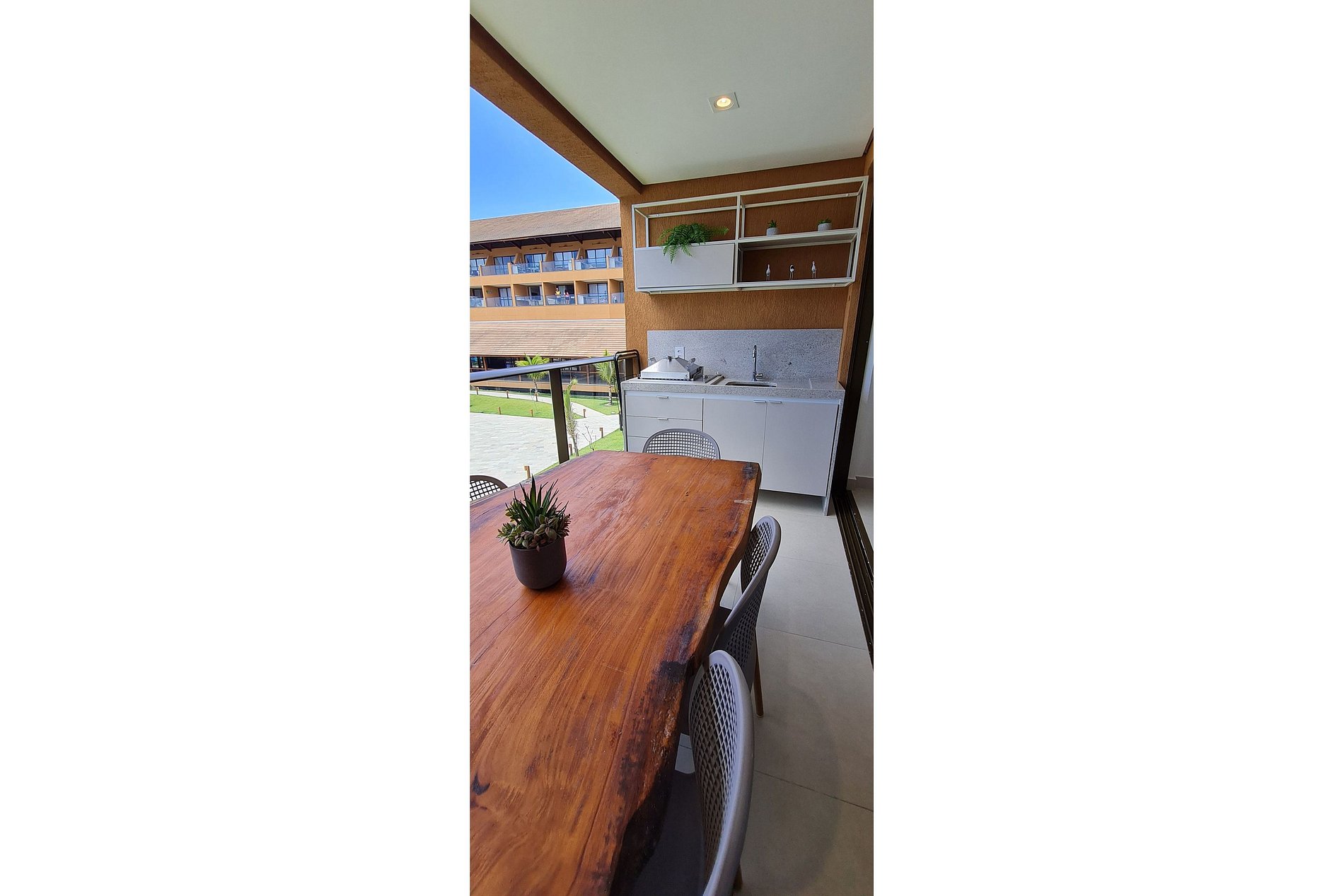 The gourmet balcony features a rustic table, electric barbecue grill, ice machine, cooler, and Smart TV — perfect for leisure moments and outdoor meals.
