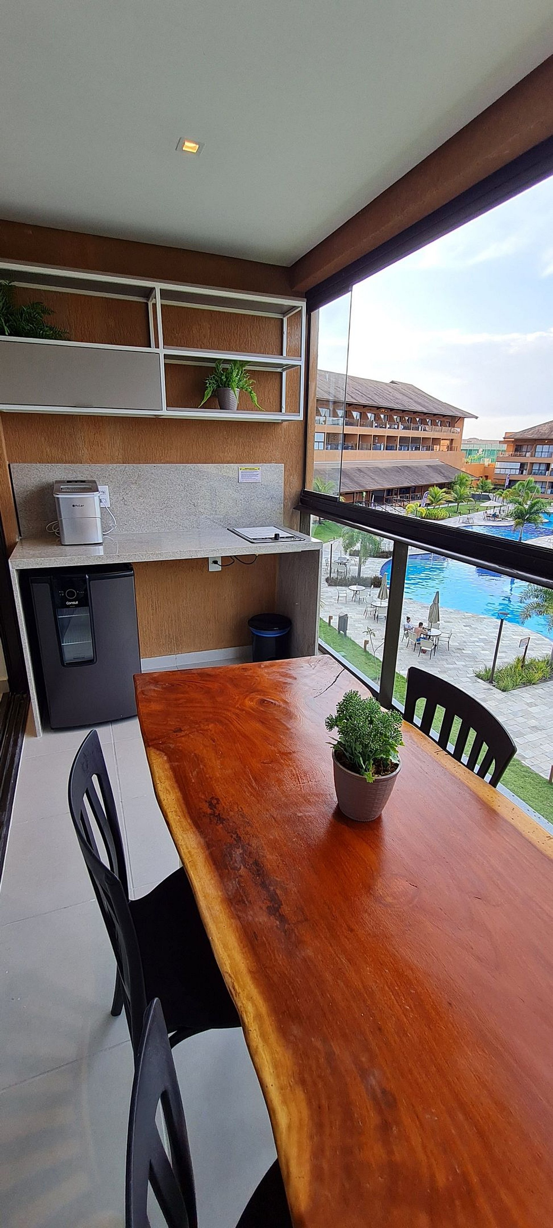 The gourmet balcony features a rustic table, ice machine, electric barbecue grill, cooler, Smart TV, and beer fridge.