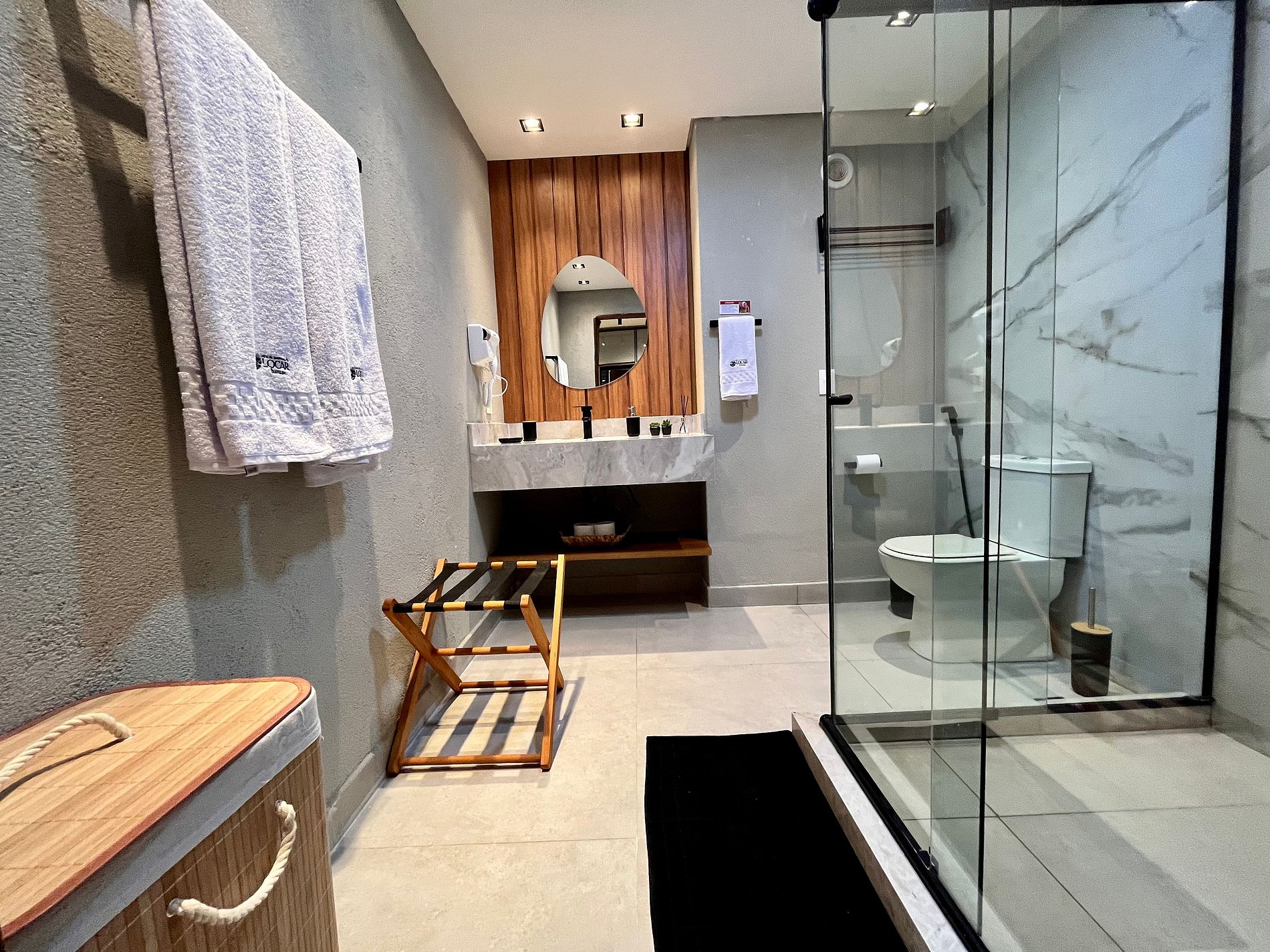 The spacious bathroom includes a hair dryer, hot shower, luggage stand, clothesline, liquid soap, and shampoo.