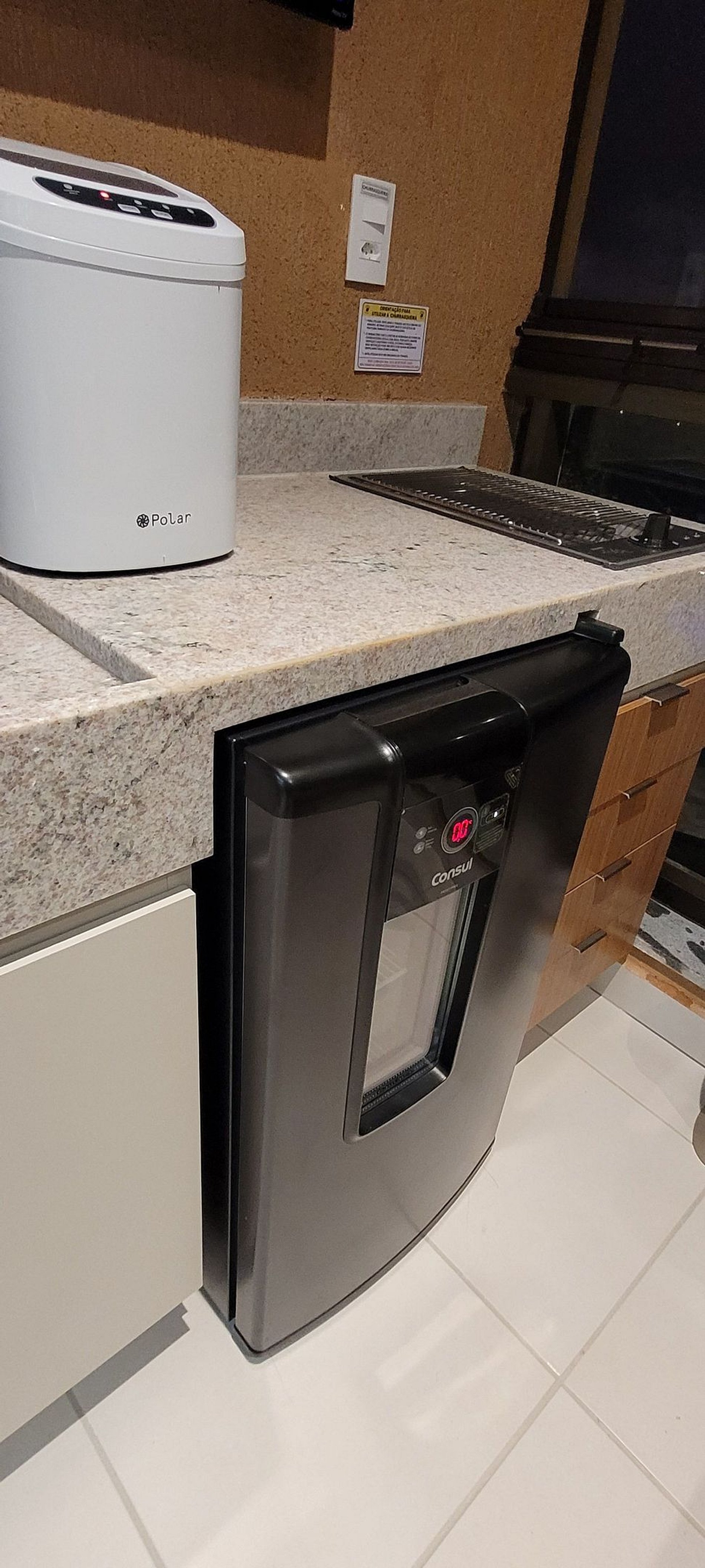 El balcón gourmet cuenta con mesa rústica, máquina de hielo, parrilla eléctrica, cooler y cervecera.