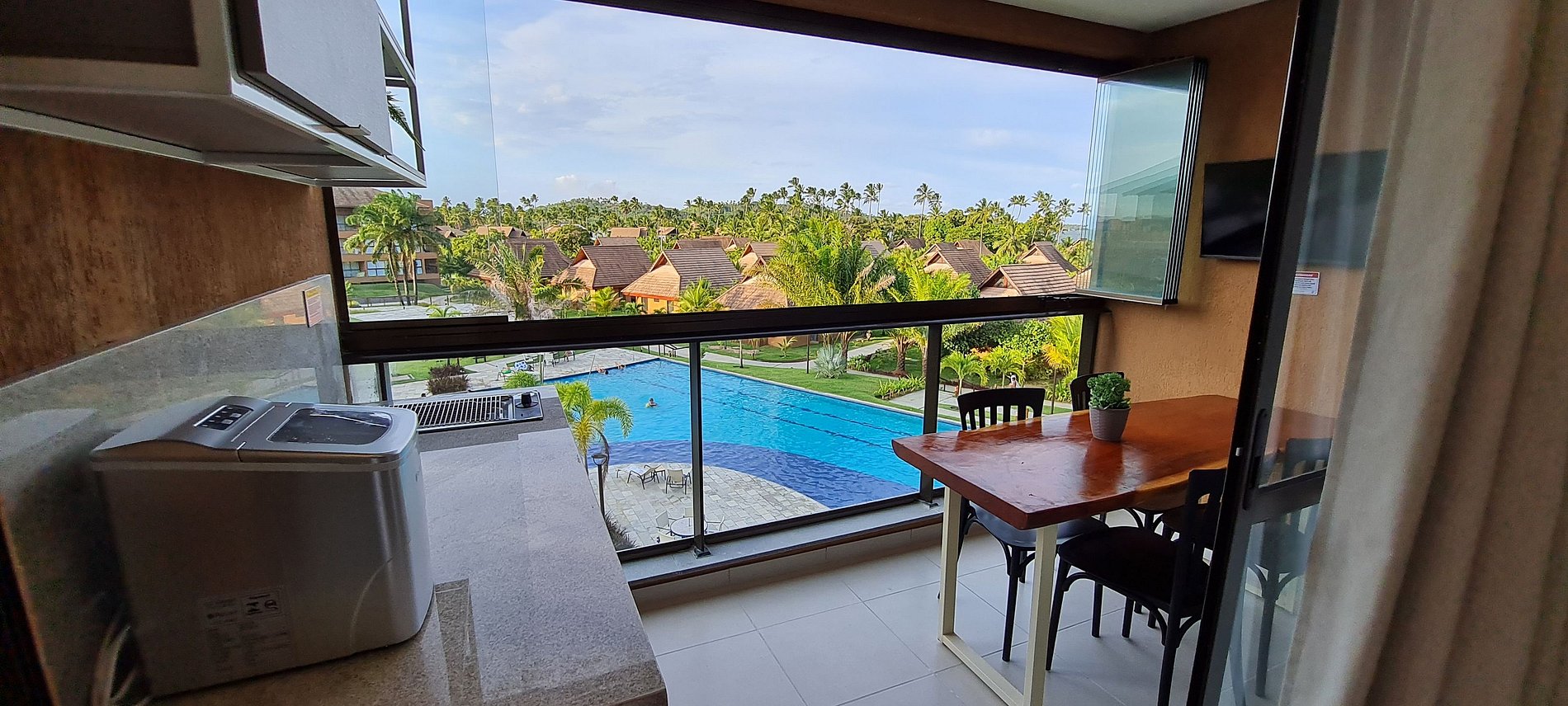 El balcón gourmet cuenta con mesa rústica, máquina de hielo, parrilla eléctrica, cooler, TV Smart y cervecera.