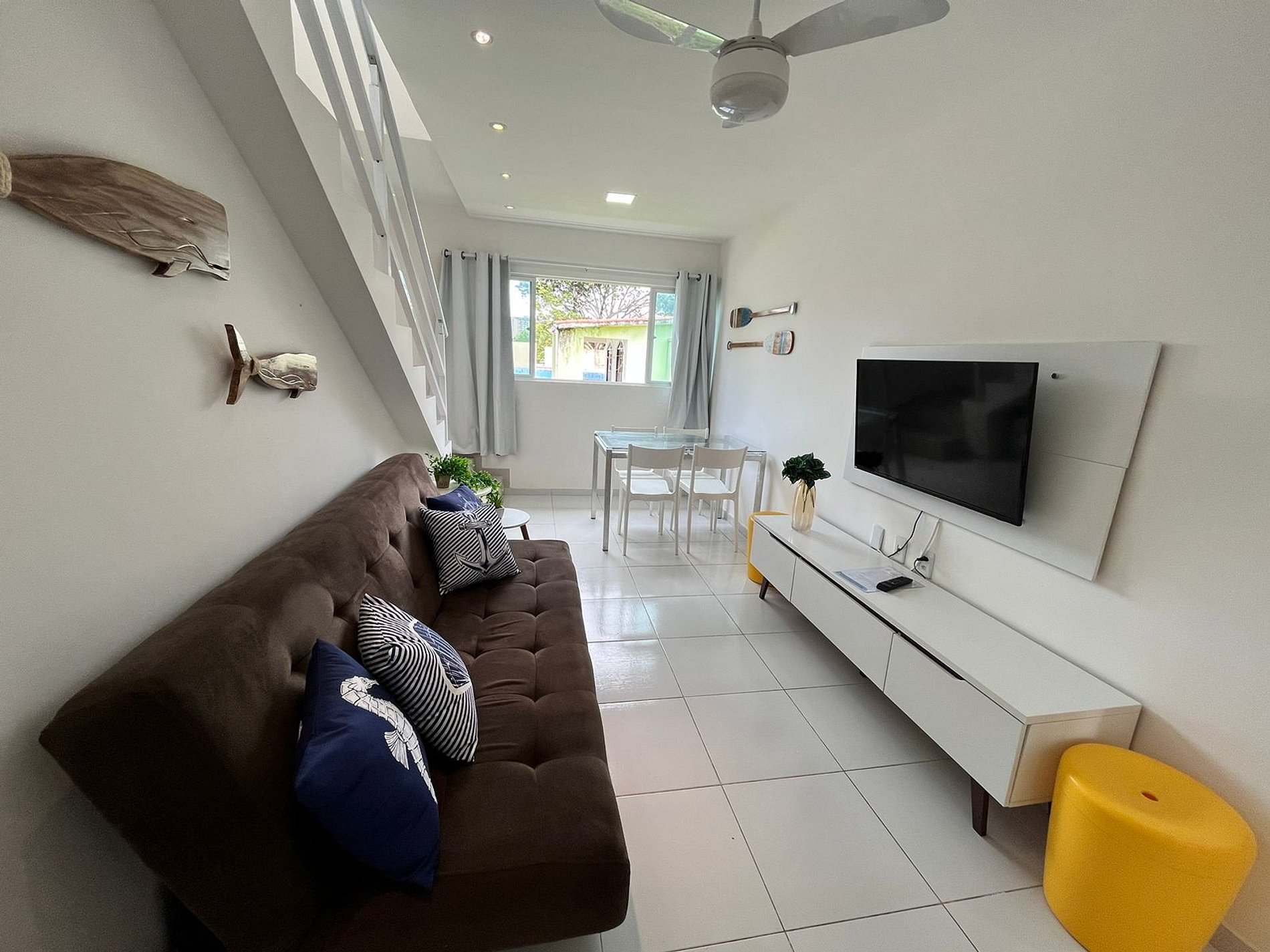 A sala para dois ambientes é aconchegante e arejada, equipada com sofá-cama e ventilador de teto, integrada à cozinha completa, que dispõe de fogão, geladeira, micro-ondas, liquidificador, sanduicheira e todos os utensílios necessários para preparar suas refeições com praticidade e estilo.