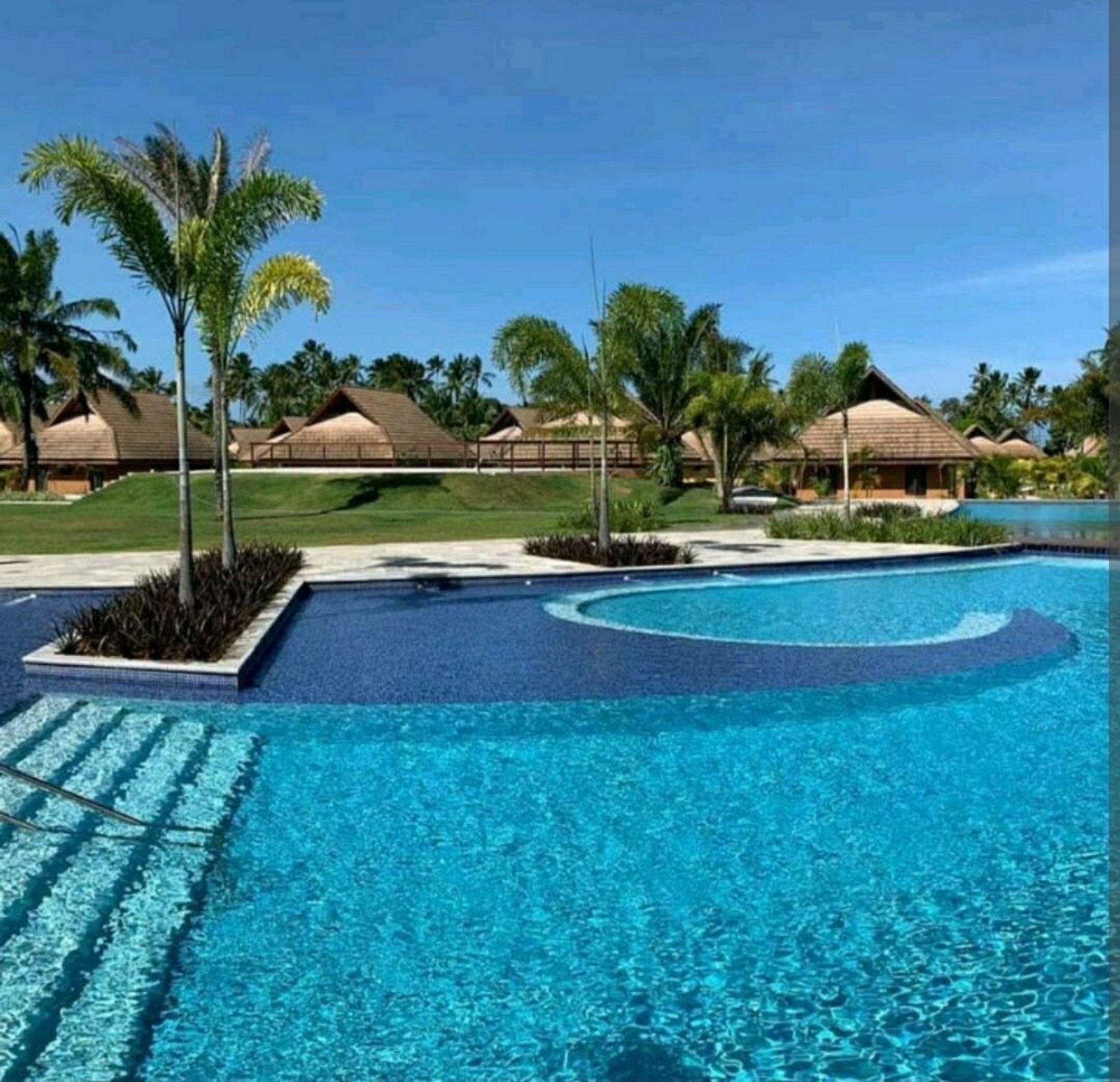 O resort é na beira do mar. Guarda-sóis, espreguiçadeiras. A praia é de fácil acesso a partir do resort