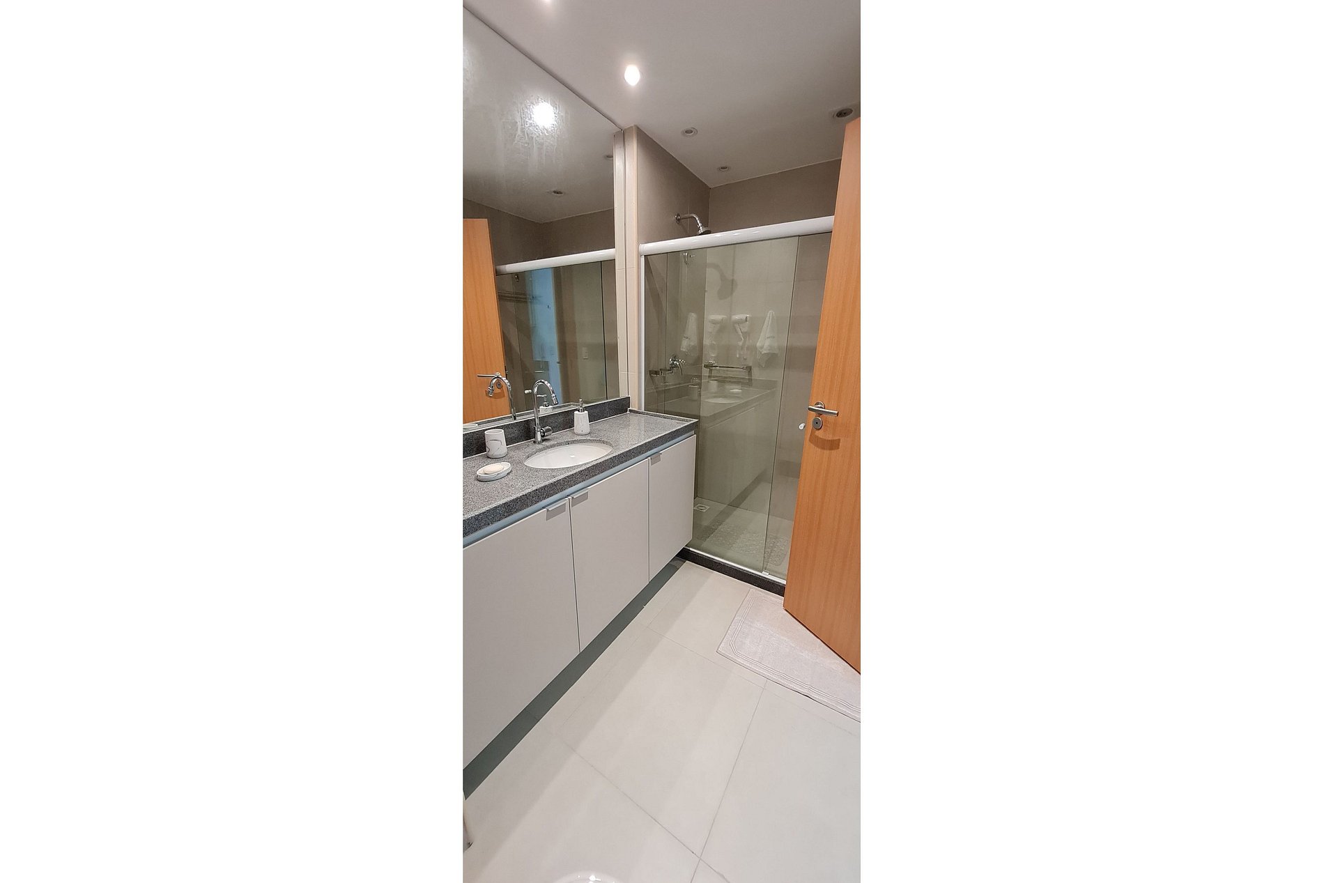 O banheiro é espaçoso, com ducha aquecida, secador de cabelo, varal de roupas, sabonete líquido e shampoo.