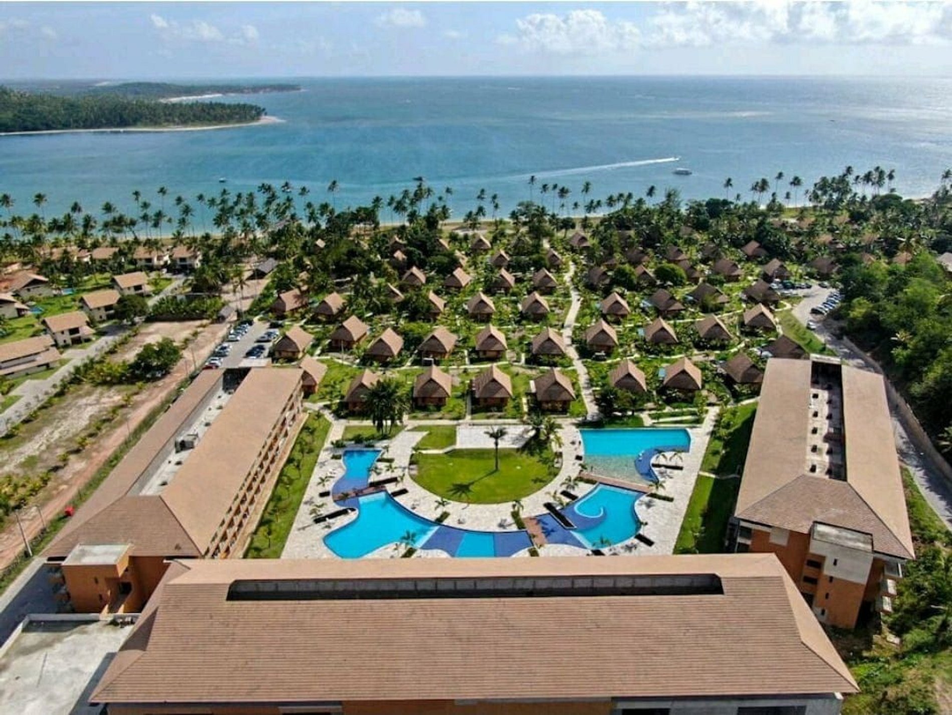 O resort é na beira do mar. Guarda-sóis, espreguiçadeiras. A praia é de fácil acesso a partir do resort