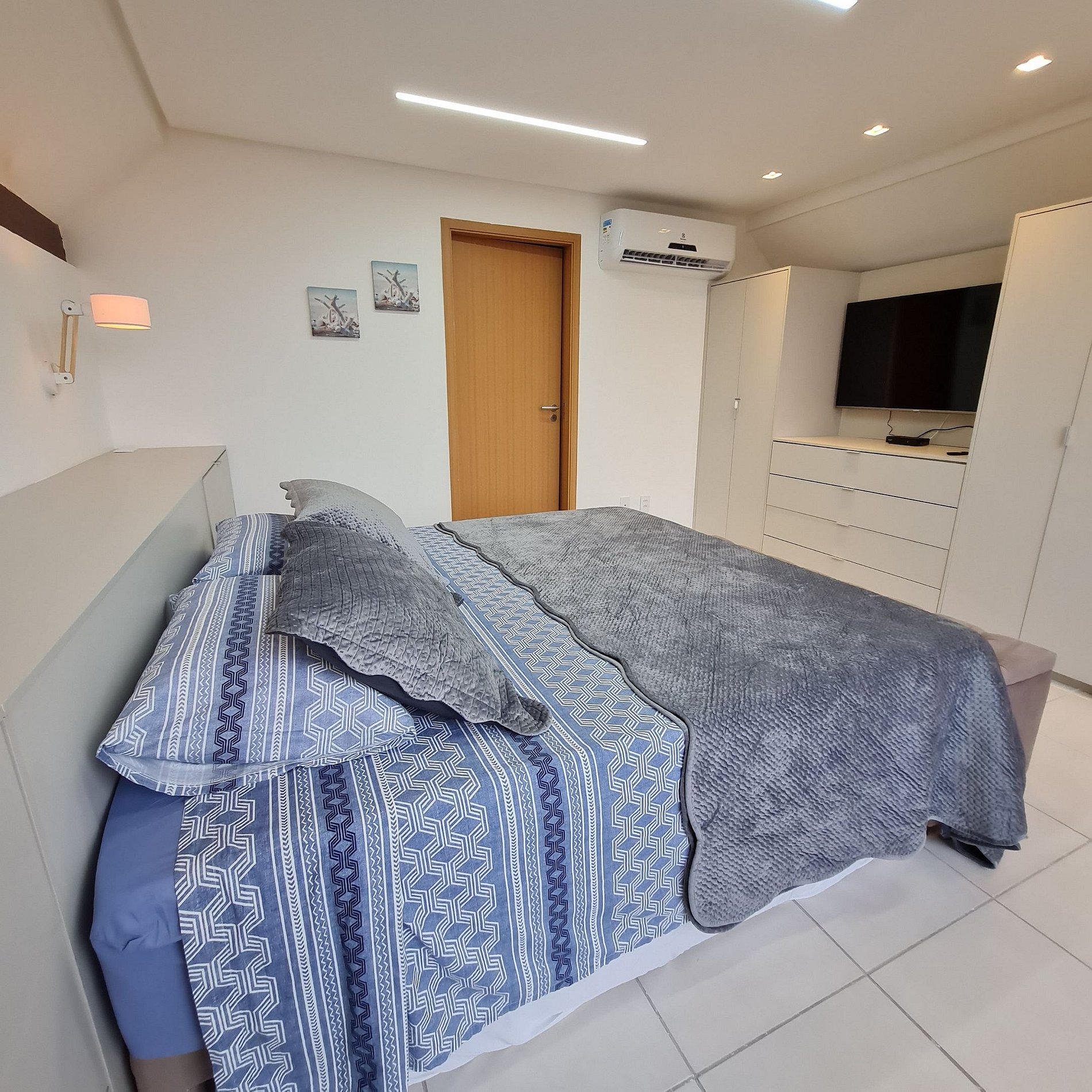 Suíte Master (com varanda): cama Super King + 2 bicamas de solteiro, ar-condicionado, TV Smart, closet com ferro de passar e enxoval completo.