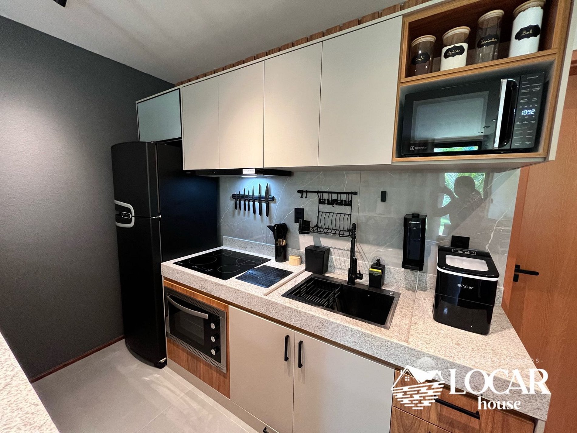 A cozinha é totalmente equipada com geladeira, fogão por indução, forno elétrico, micro-ondas, airfryer, sanduicheira, cafeteira, liquidificador e todos os utensílios domésticos necessários. Disponibilizamos também panela de fondue (carne ou queijo) mediante solicitação 24h antes do check-in. Copos e taças de vidro para vinho, cerveja, whisky e espumante e copos de acrílico para uso na piscina ou praia também estão disponíveis.