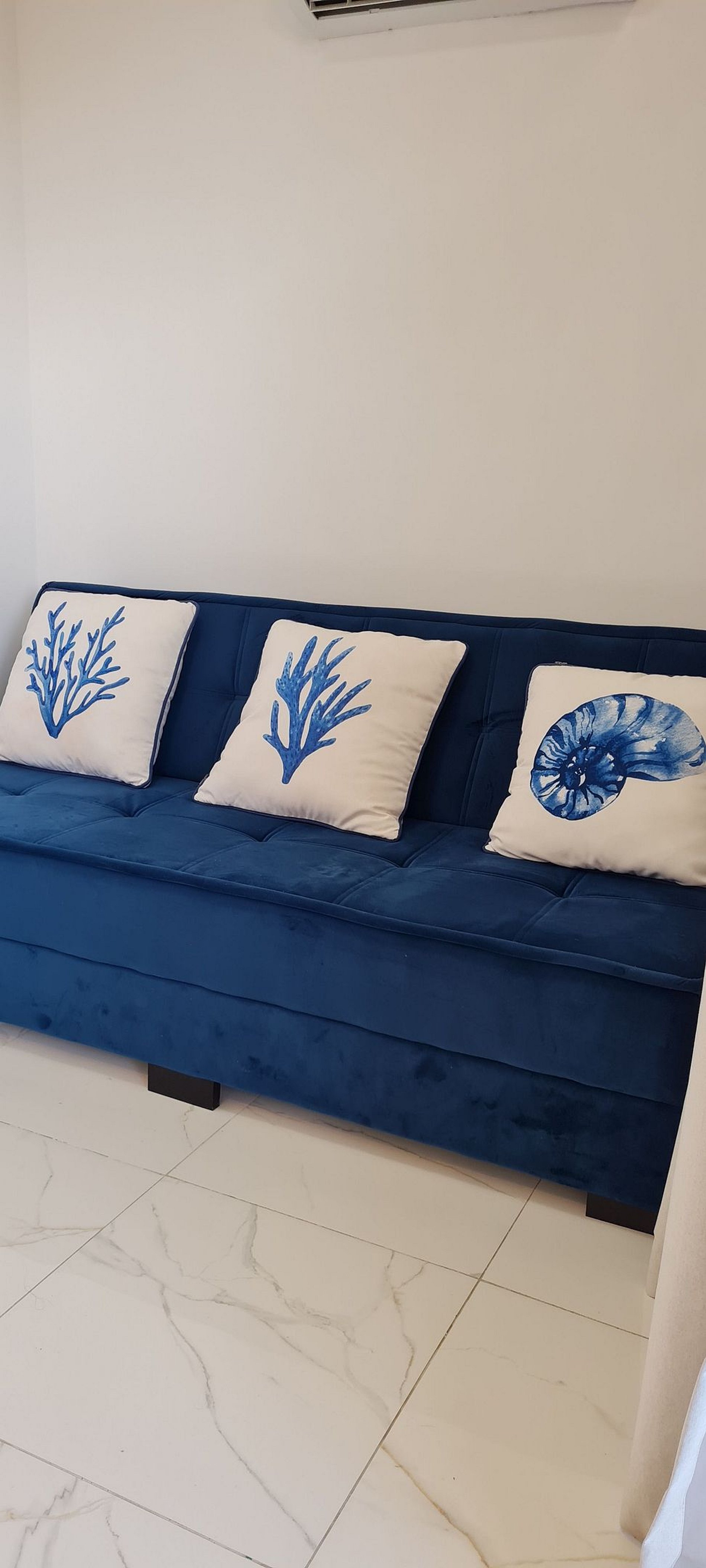 A sala com ar condicionado, sofá cama casal, TV Smart,