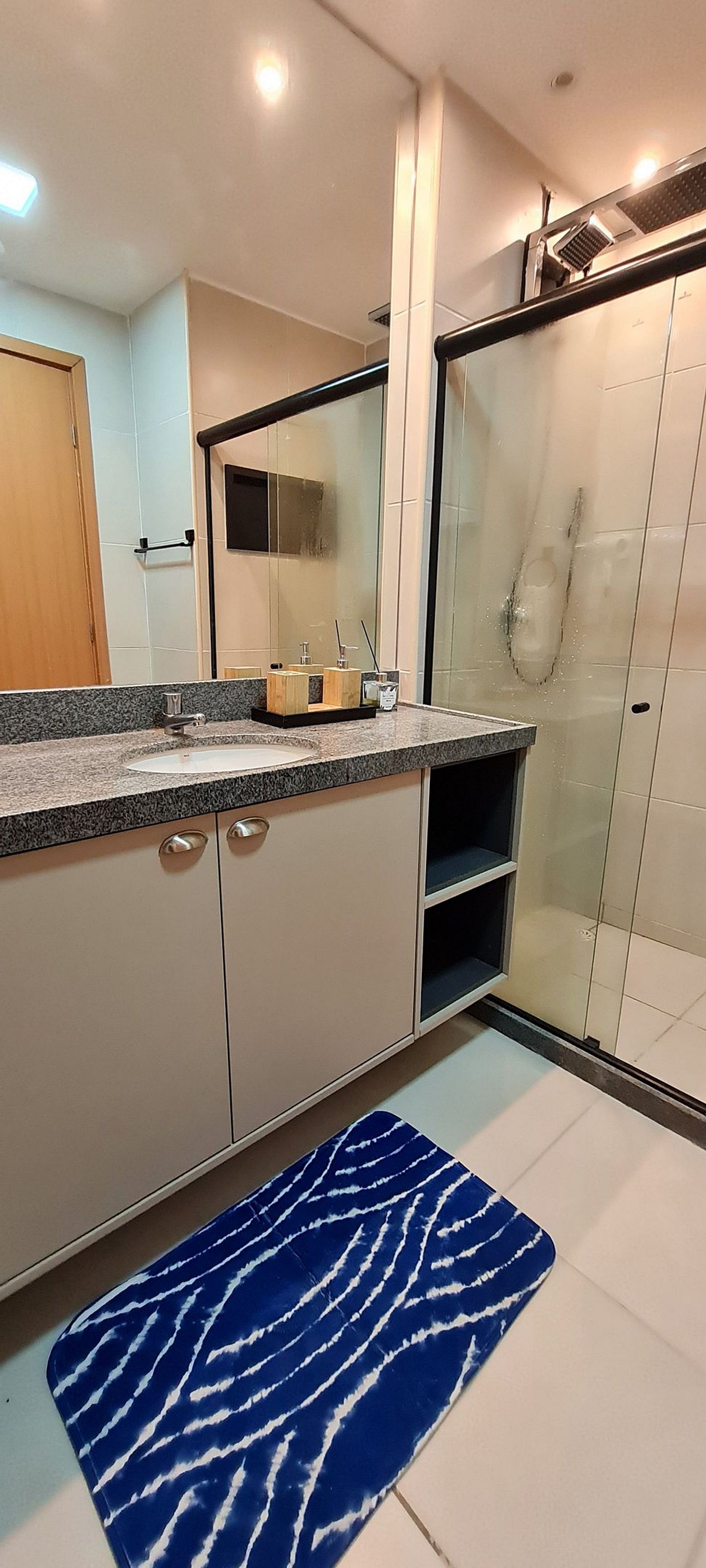 O banheiro super espaçoso com secador de cabelo, ducha aquecida, varal de roupas, sabonete líquido e shampoo.