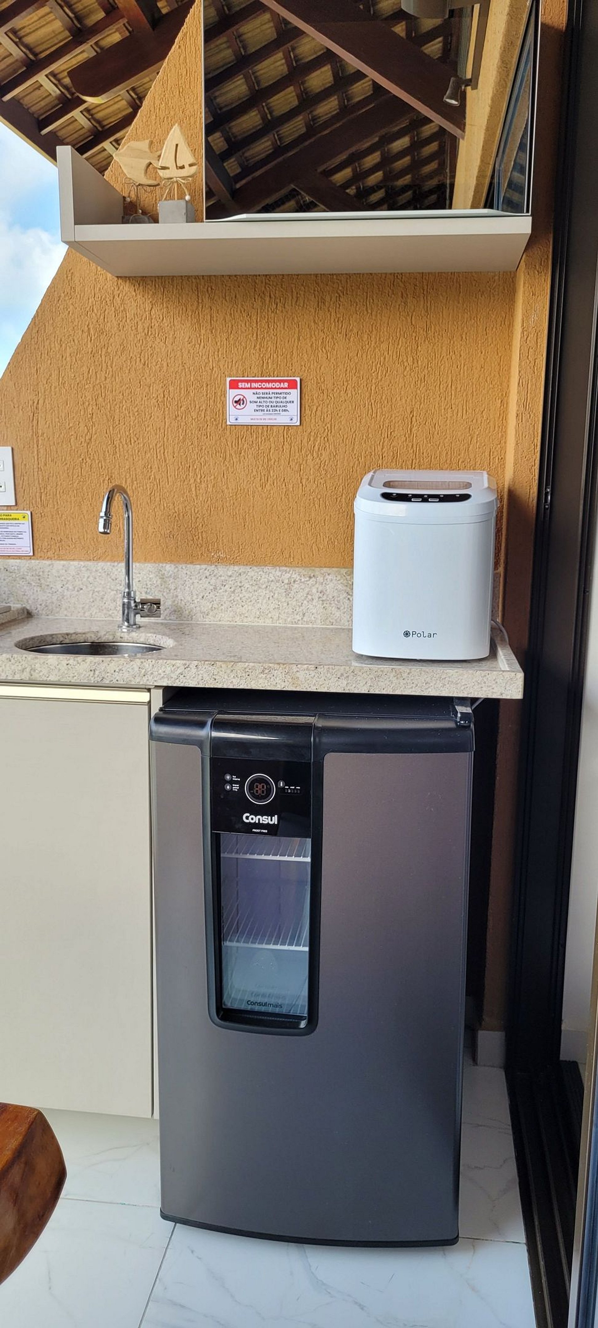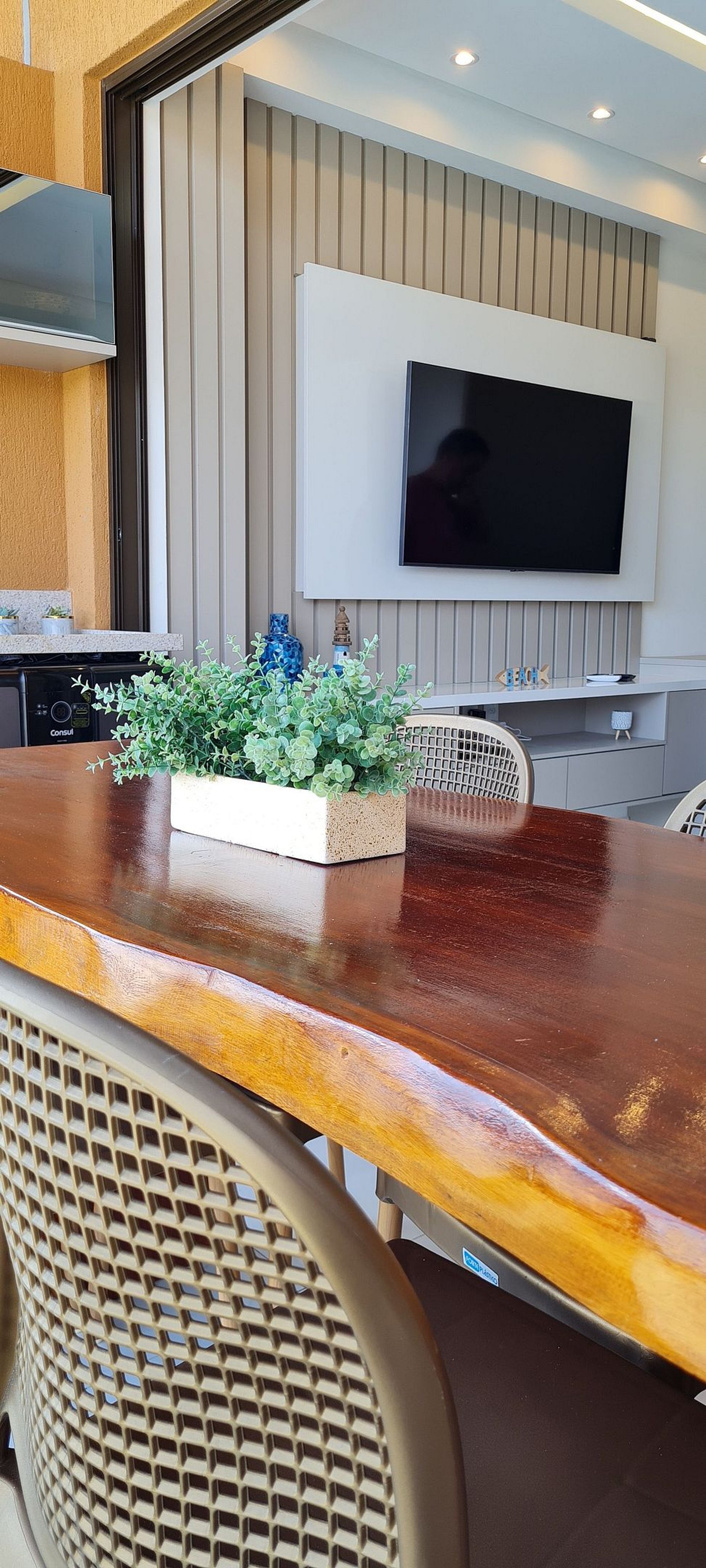 A varanda gourmet possui mesa rustica, máquina de gelo, churrasqueira elétrica, cooler e Cervejeira
