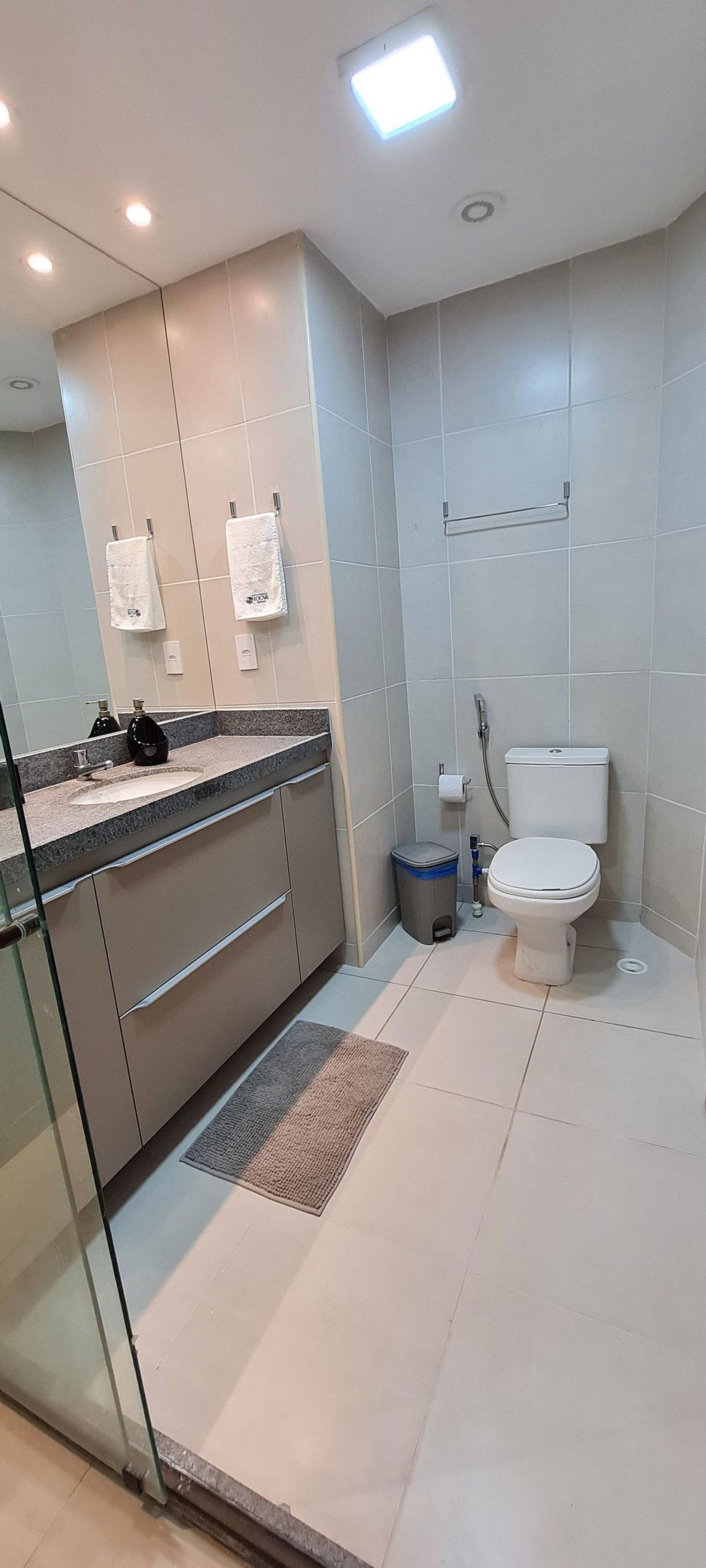 O banheiro super espaçoso com secador de cabelo, ducha aquecida, varal de roupas, sabonete líquido e shampoo.