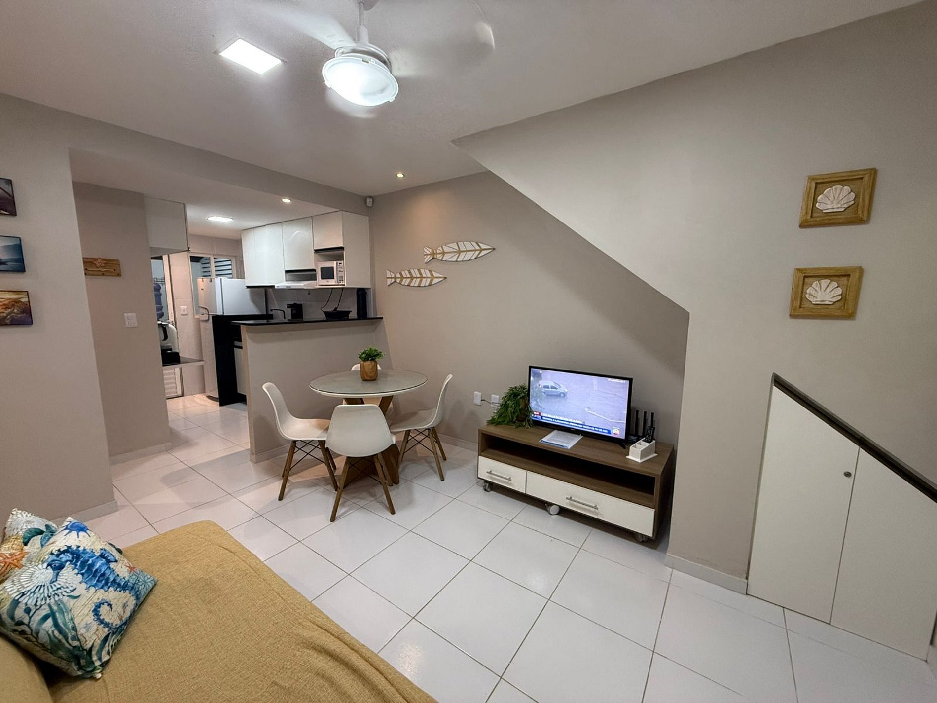 A sala para dois ambientes possui sofá-cama e ventilador de teto, proporcionando um espaço agradável para relaxar.